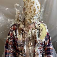 StagedStooge was surprised by michiganpie1 with a big sloppy cream pie to the face